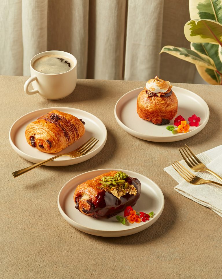 Photographie culinaire professionnelle d’un assortiment de pains et viennoiseries sur une surface en marbre, réalisée par Jazz Photo, studio de photographie commerciale à Boucherville.