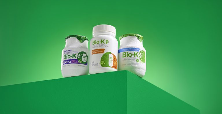 Photographie produit professionnelle de bouteilles de probiotiques Bio‑K posées sur un plateau de marbre avec un bol de yogourt garni de granola et graines, réalisée par Jazz Photo, studio de photographie commerciale à Boucherville.