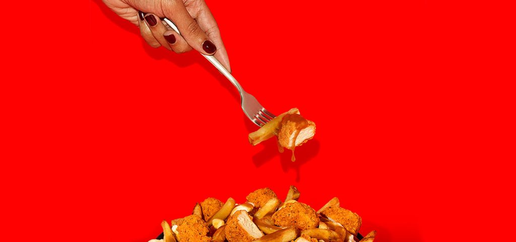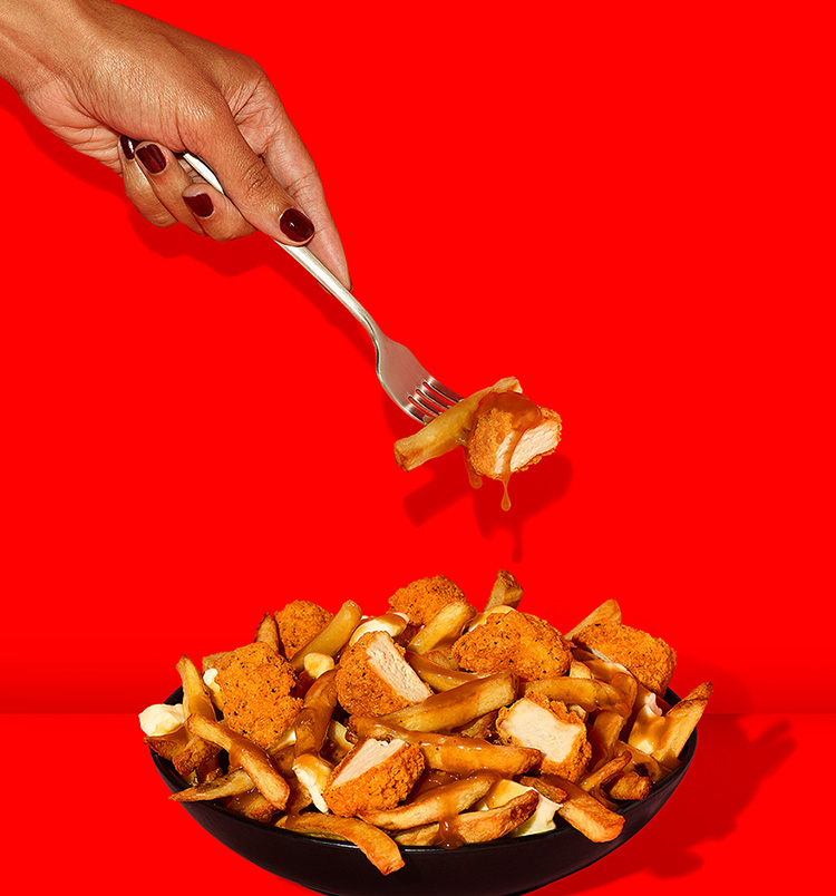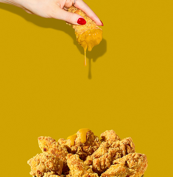 Photographie culinaire professionnelle d’un empilement de gaufres dorées et de morceaux de poulet frit arrosés de sirop sur un fond orange, réalisée par Jazz Photo, studio de photographie commerciale à Boucherville.