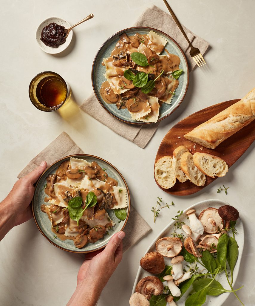 Photographie culinaire professionnelle d’un ensemble de casseroles en acier inoxydable présentant des pâtes, une sauce tomate et des légumes, réalisée par Jazz Photo, studio de photographie commerciale à Boucherville.